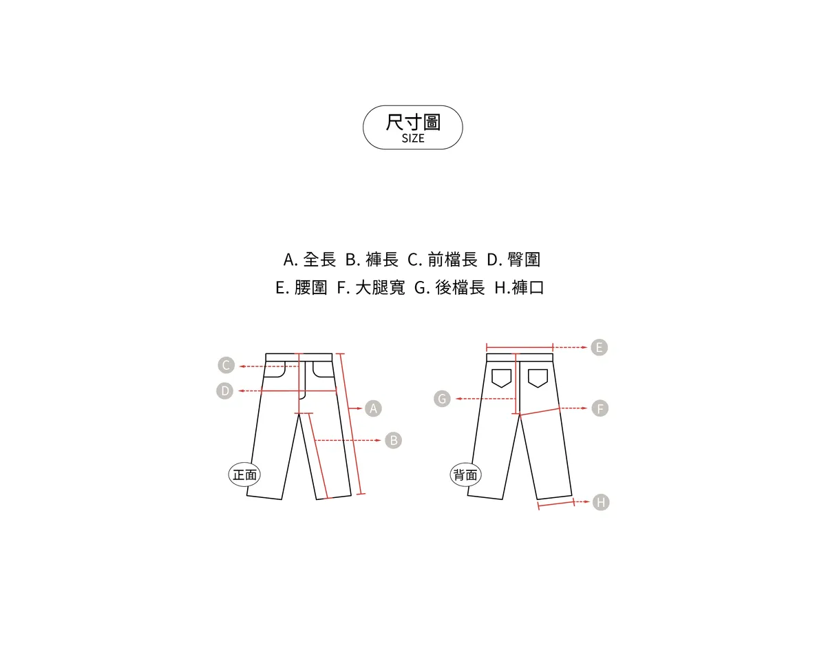 | 褲子(cm) | 全長 | 腰寬 | 臀寬 | 前襠長 | 後襠長 | 褲口 | 大腿寬 |