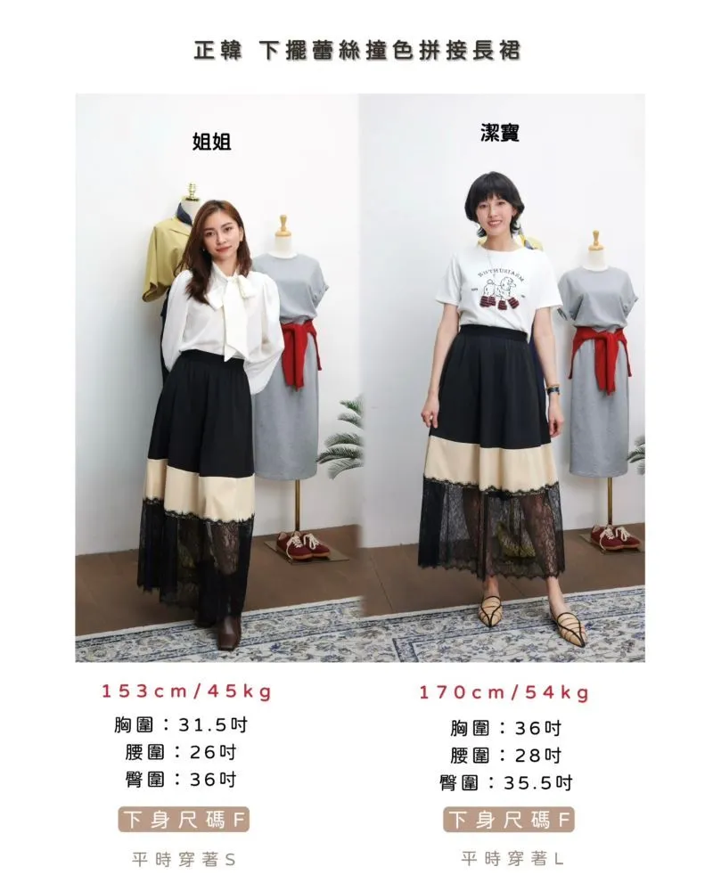 名字 身高 體重 胸圍 腰圍 臀圍 平常穿 此款穿 阿0 152cm 45kg 30吋 25吋 35吋 S F -▪️ 親膚度:⭐⭐⭐⭐⭐▪️ 材質:彈力布+下擺拼接蕾絲▪️ 彈性:有彈性▪️ 其他:不刺/不透/腰頭鬆緊+側拉鍊