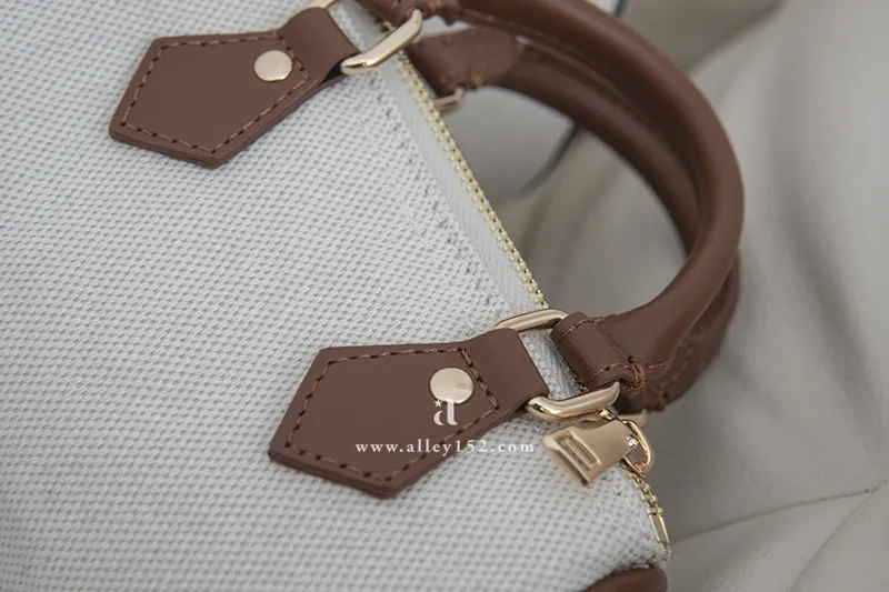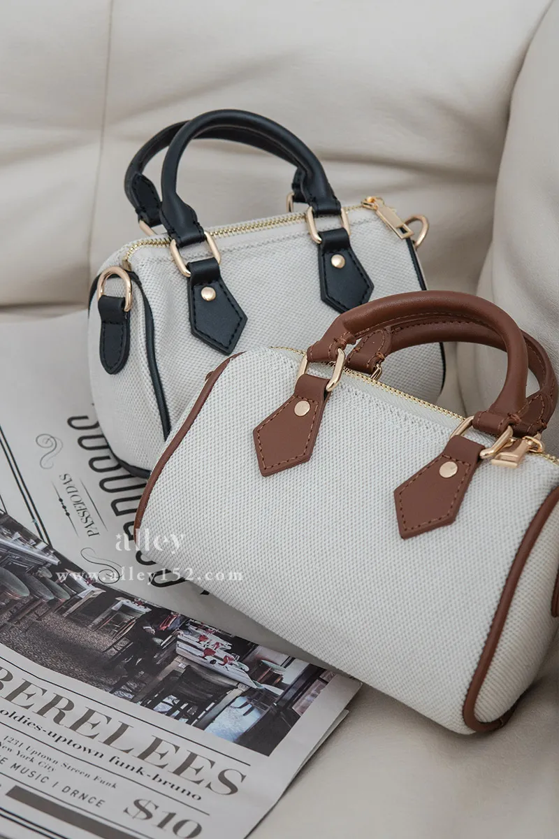 帆布拼接合成皮 / 有拉鍊 / 有內襯 / 附可拆式調節背帶