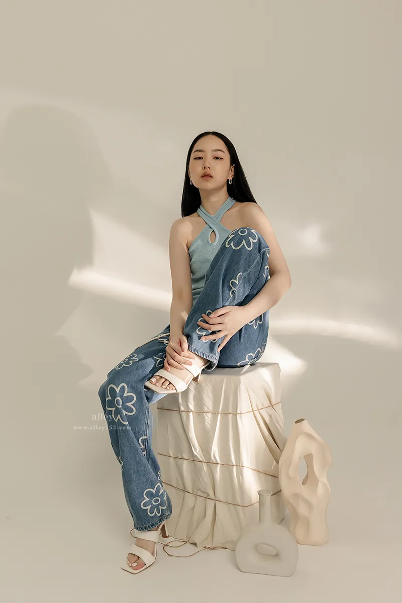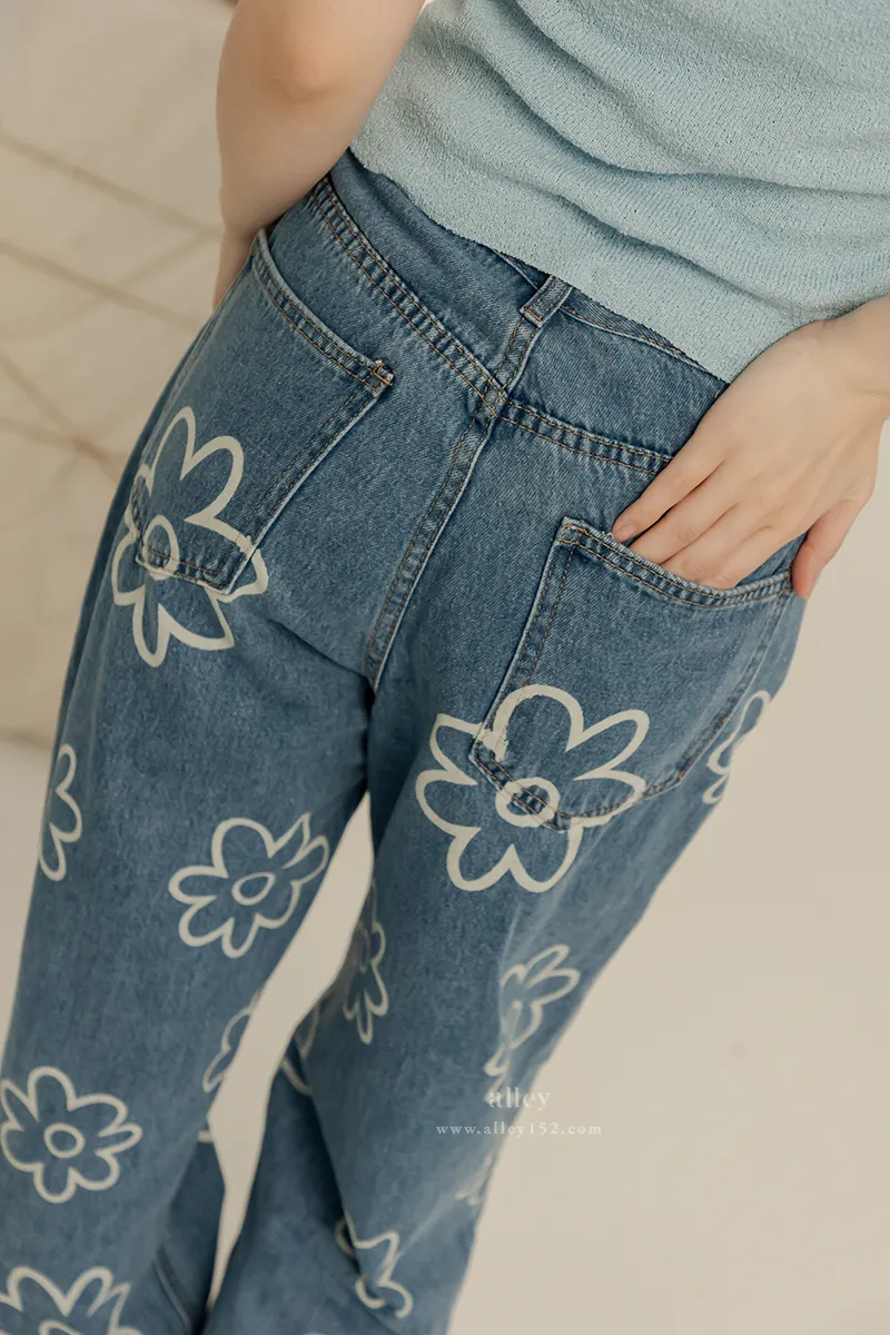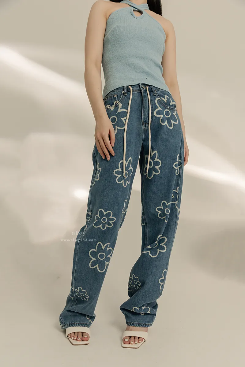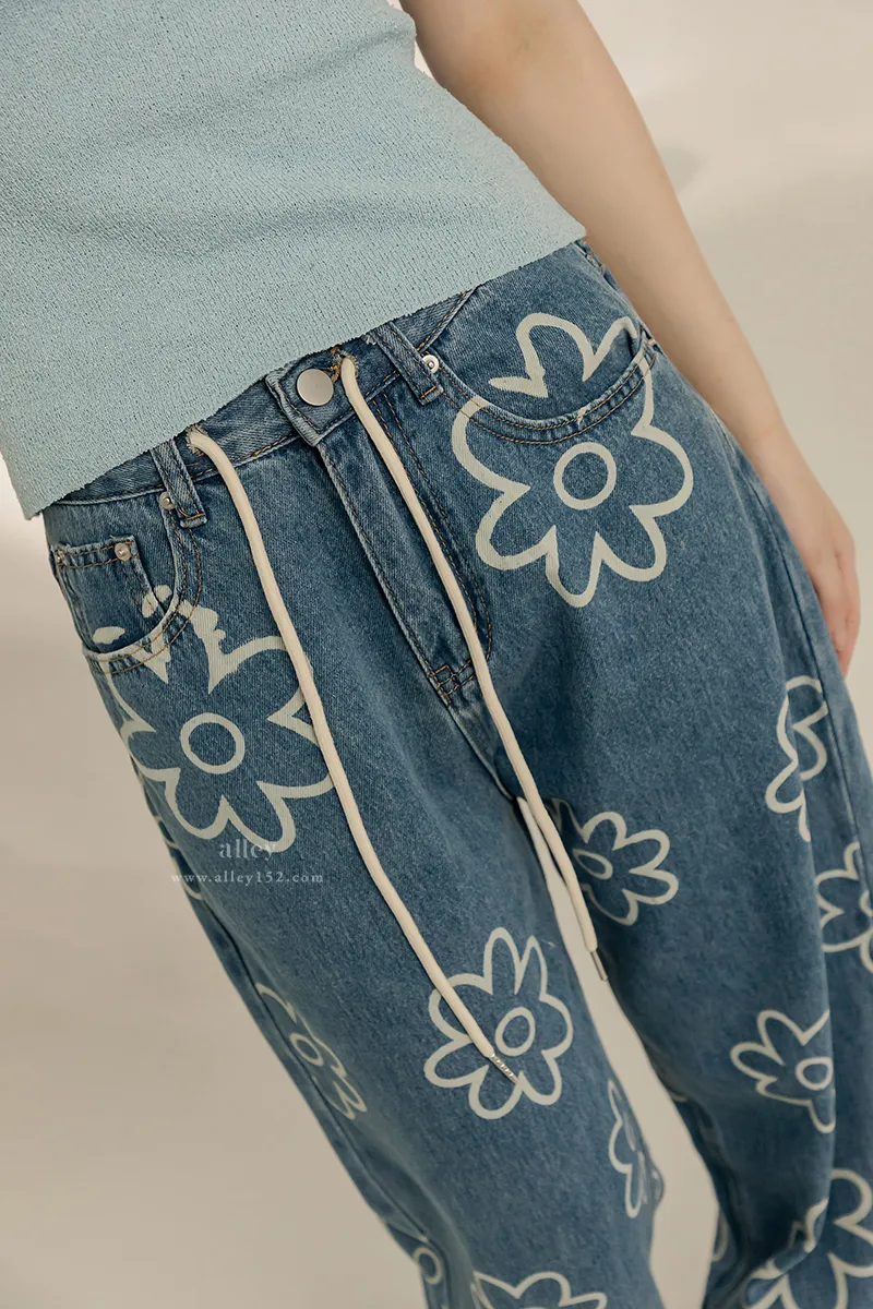 可愛花花 高腰直筒牛仔褲