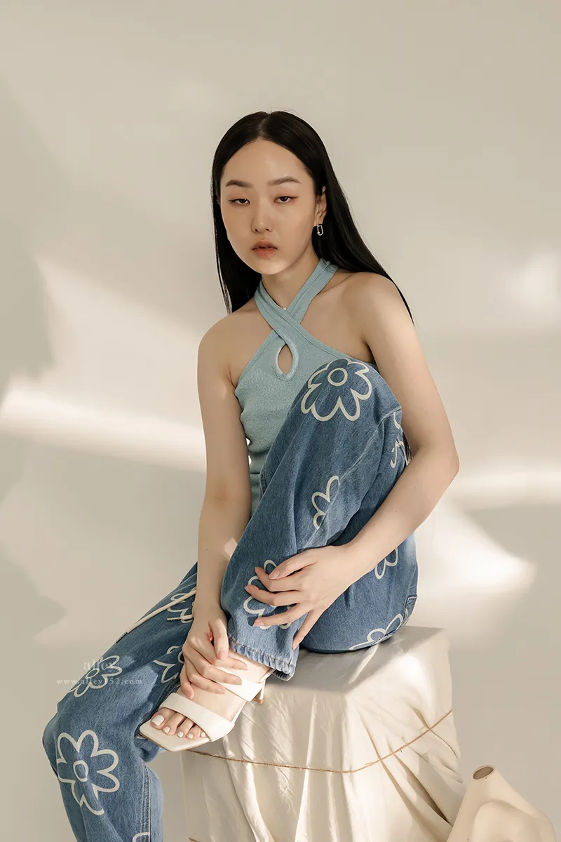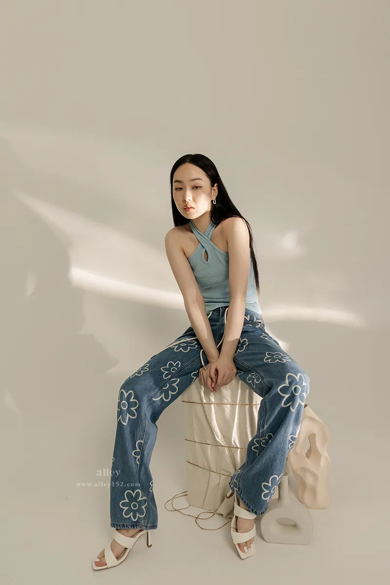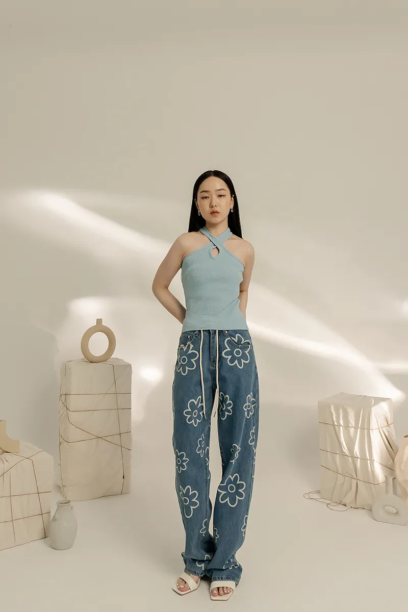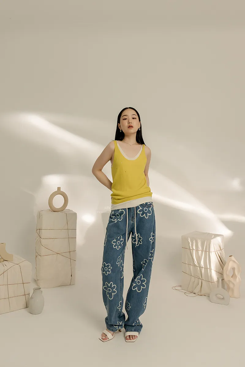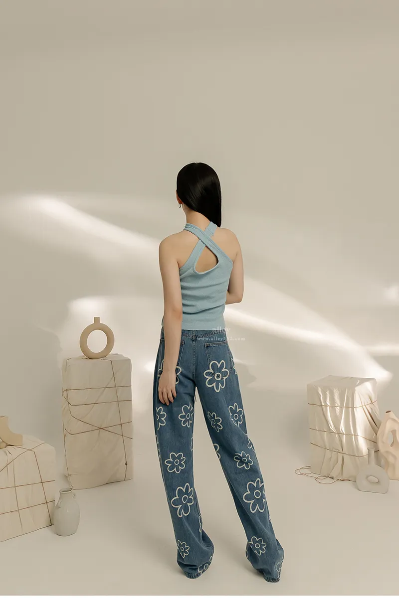 可愛花花 高腰直筒牛仔褲