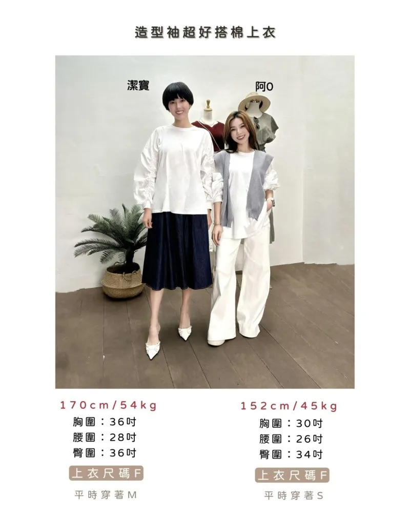 名字 身高 體重 胸圍 腰圍 臀圍 平常穿 此款穿 筱恬 162cm 45kg 30吋 24吋 36吋 S F ▪️ 親膚度:⭐⭐⭐⭐⭐▪️ 成分:衣身:棉混聚脂纖維,袖子:棉▪️ 彈性:有彈性▪️ 其他:不刺/建議搭淺色內衣/袖子有伸縮鬆緊帶造型