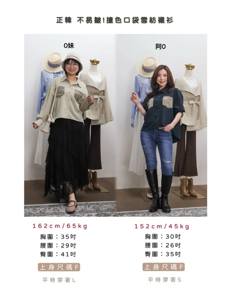 名字 身高 體重 胸圍 腰圍 臀圍 平常穿 此款穿 阿0 152cm 45kg 30吋 25吋 35吋 S F ▪️ 親膚度:⭐⭐⭐⭐⭐▪️ 材質:雪紡▪️ 彈性:無彈性▪️ 其他:不刺/不透/胸前有口袋